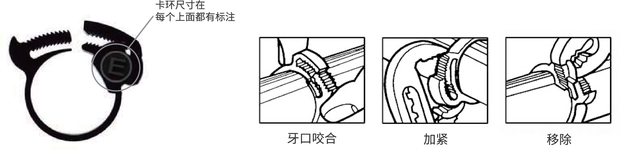 卡环大小选择方法: 请选择手紧环大小为1到3个牙可以咬紧的环,然后再全部卡紧以确保完全密闭。