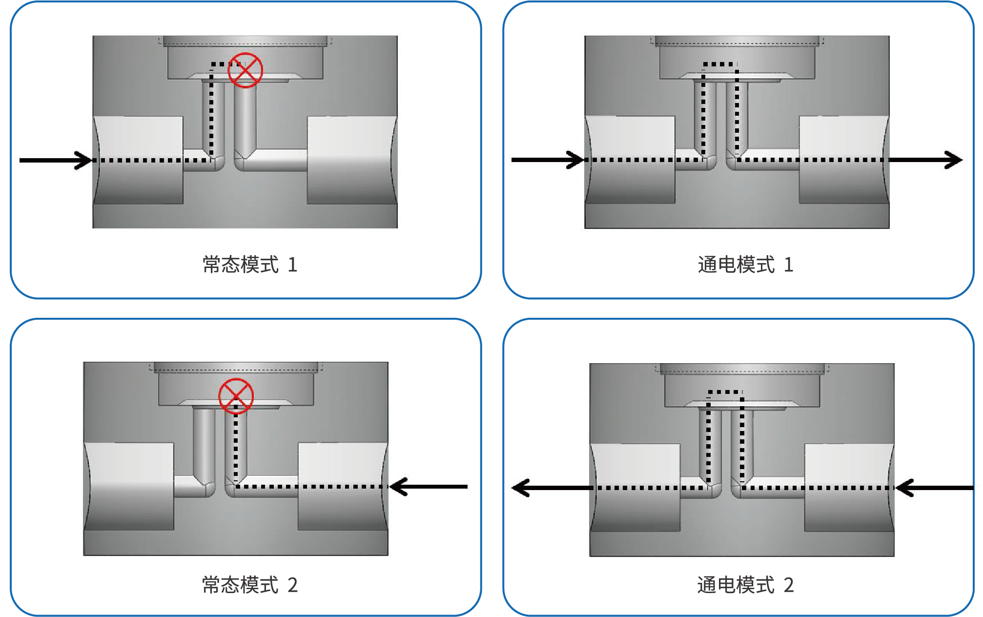 包含常态模式1、通电模式1、常态模式2、通电模式2四种工作状态(附工作原理图)