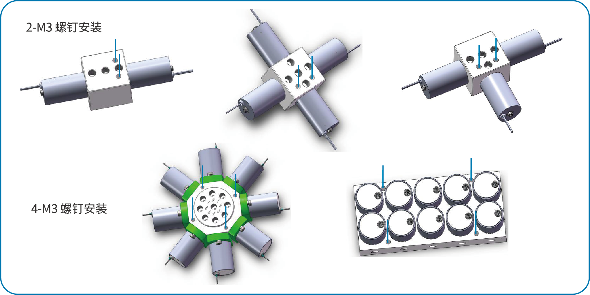 找到产品自身安装孔,采用M3螺钉进行紧固,支持2-M3螺钉安装、4-M3螺钉安装两种方式。