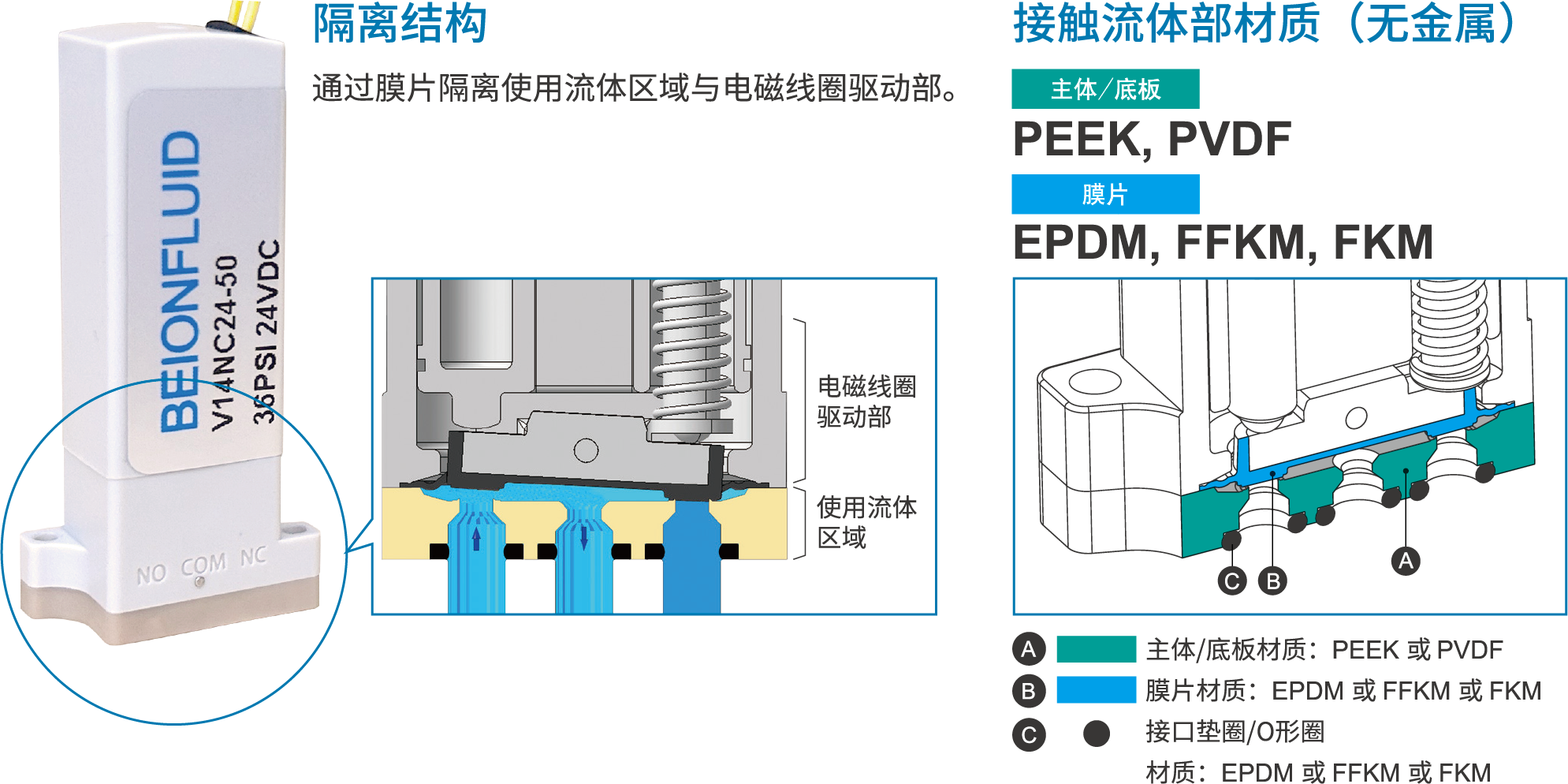 隔离结构:通过膜片隔离流体区域与电磁线圈驱动部,接触流体部无金属